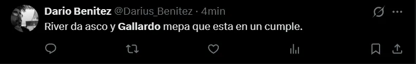 En las redes sociales también hubo muchos cuestionamientos. Y además de criticar las formas que tiene el Muñeco para armar el equipo, a través de X (ex Twitter) pidieron por su salida: “River da asco y Gallardo mepa que está en un cumple”, escribió el usuario @darius_benitez.