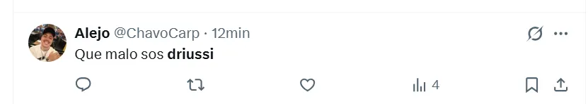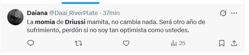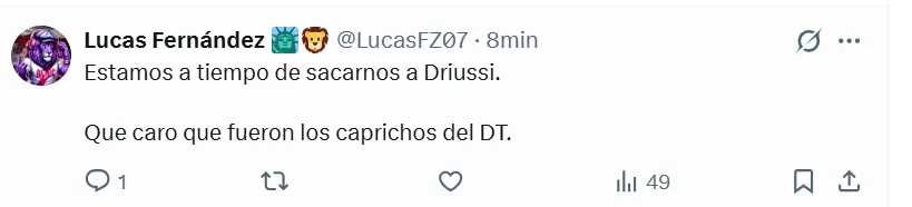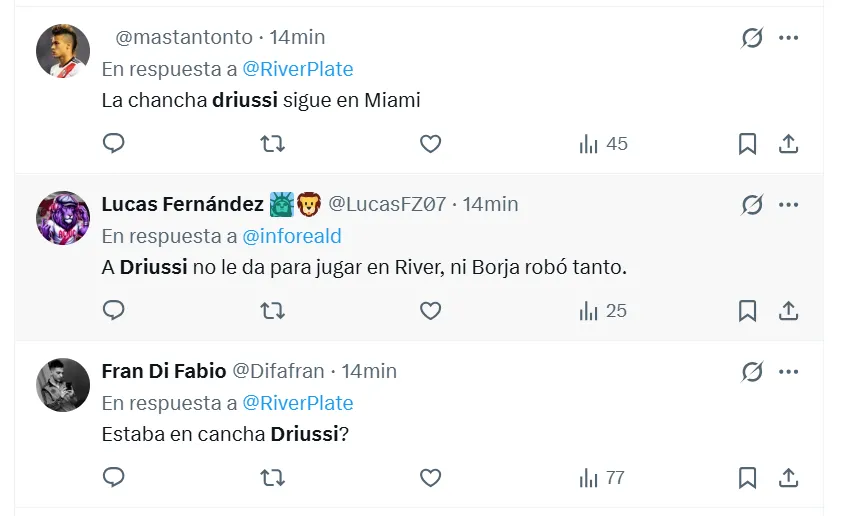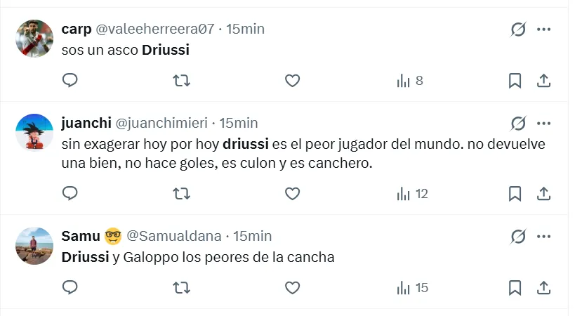 “Estaba en cancha Driussi?”, “Driussi es una momia”, “Driussi sigue en Miami”, “Que malo sos Driussi”, “A Driussi no le da para jugar en River”, “Hoy por hoy Driussi es el peor jugador del mundo”, “Driussi nunca más”, fueron algunos de los comentarios criticando al delantero del Millonario.