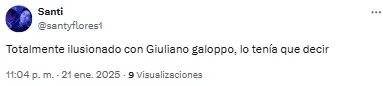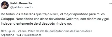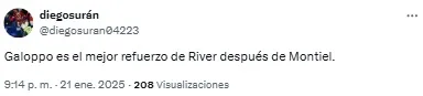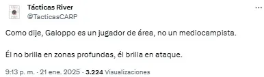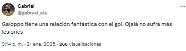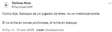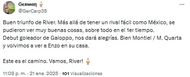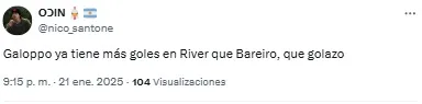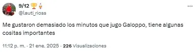 En las redes, los fanáticos del Millonario se preguntaron: “¿Muy temprano para subirse al tren del chico Galoppo?”. Otro, en cambio, sintetizó: “Debut goleador de Galoppo. Nos dará alegrías”.