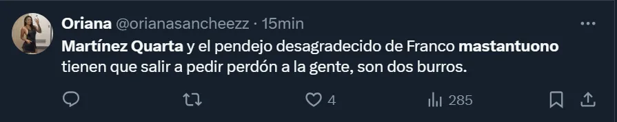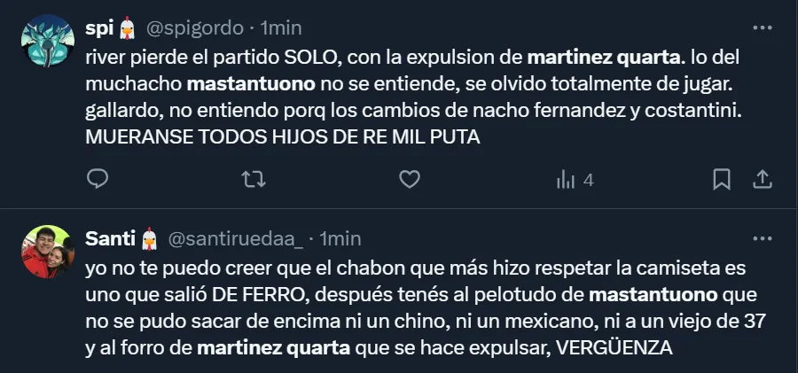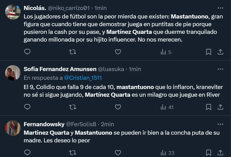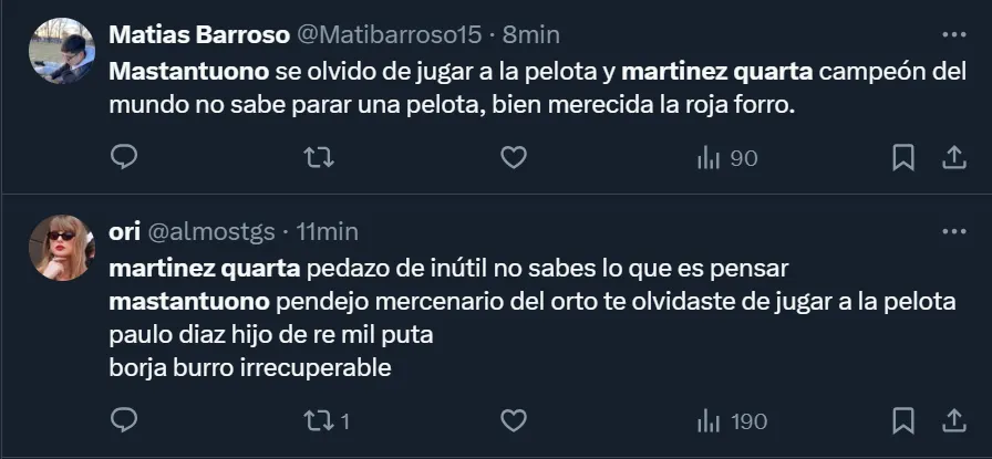 “Martínez Quarta y el pendejo desagradecido de Franco Mastantuono tienen que salir a pedir perdón a la gente, son dos burros”, exclamó @orianasancheezz, una de las tantas fanáticas del club del barrio porteño de Núñez, a través de Twitter.