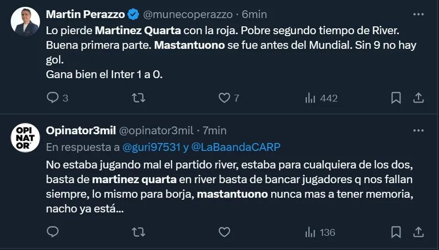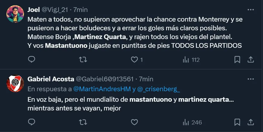 A los fanáticos del Millonario, además de molestarles el resultado en sí, también se mostraron muy enojados por lo que fueron las presentaciones de Lucas Martínez Quarta y Franco Mastantuono, quienes fueron los principales apuntados de la derrota. De hecho, cuestionaron muchísimo al defensor por la expulsión y al extremo por sus flojas presentaciones, a quien acusaron de estar pensando en Real Madrid.