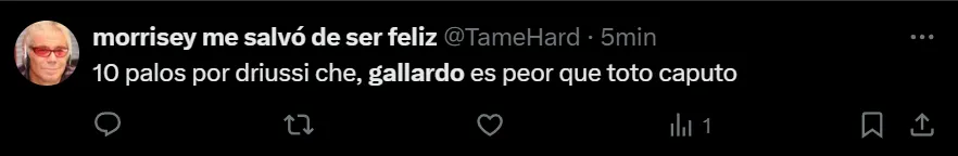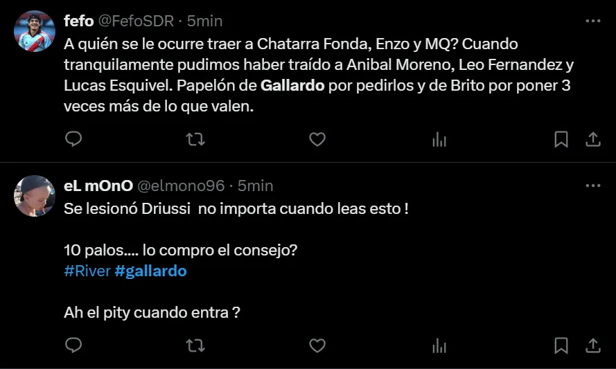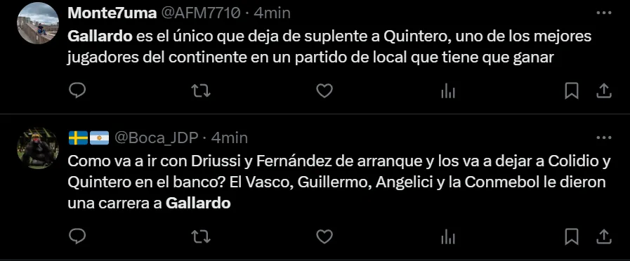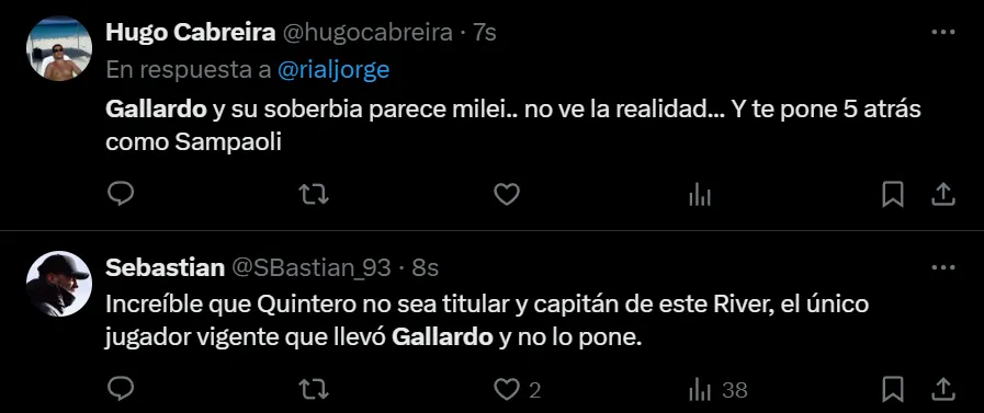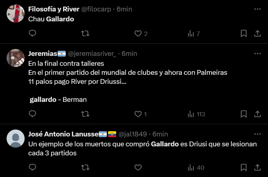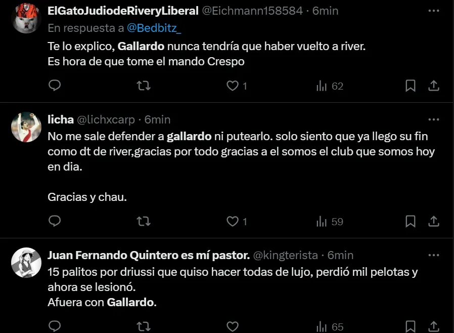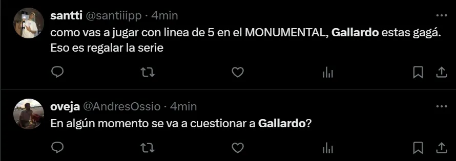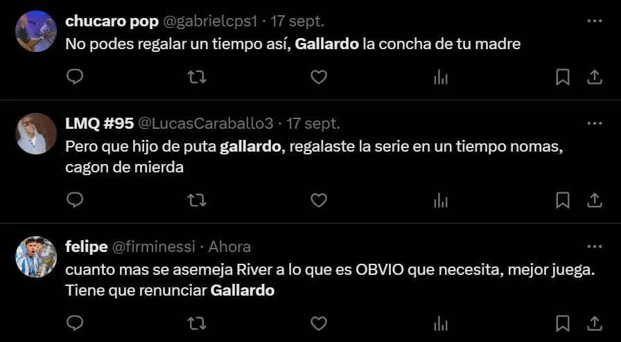 Si bien desde el resultado la llave está abierta, ya que si River convierte rápido en Brasil tendrá serias chances de alcanzar los penales, el juego del Verdão puso en jaque las falencias defensivas de los argentinos. A raíz de ello, los hinchas llenaron de críticas al entrenador: “No me sale defender a Gallardo ni putearlo. Solo siento que ya llegó su fin como DT de River. Gracias por todo, gracias a él somos el club que somos hoy en día. Gracias y chau”, exclamó el usuario @lichxcarp en Twitter.