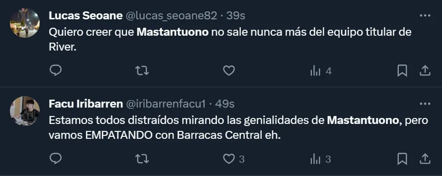 Además de pedir que se mantenga dentro de los XI, desde las tribunas virtuales exclamaron que “Mastantuono es la nueva ilusión”. Así como quedaron fanatizados con las pinceladas de Julián Álvarez y Enzo Fernández, en el Millonario enloquecieron con el juego del zurdo nacido en Azul.