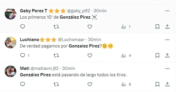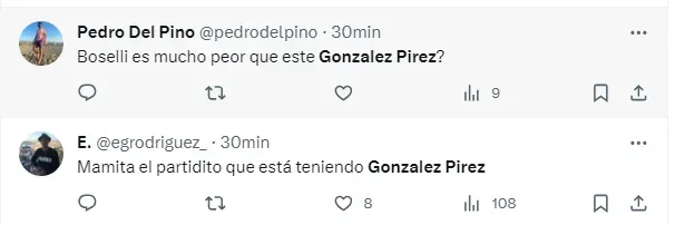 “Devuélvanlo a González Pirez”, “Gonzalez Pirez flojísimo como el último partido”, “Acá lloran a González Pirez…”, “Mamita el partidito que está teniendo Gonzalez Pirez”, fueron algunos de los tantos comentarios de los usuarios que criticaban el nivel del defensor central de 31 años.