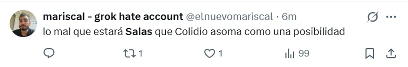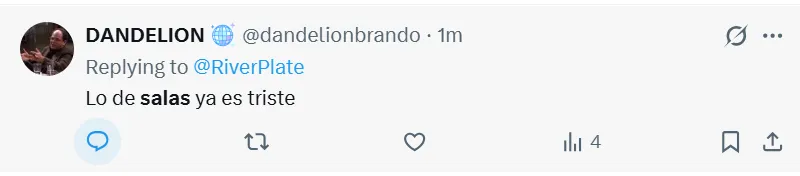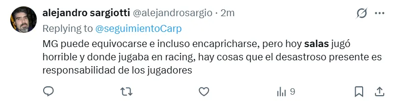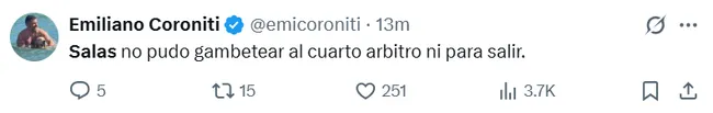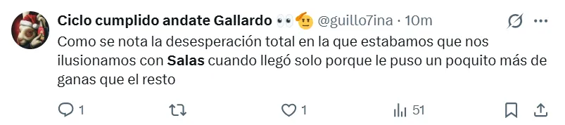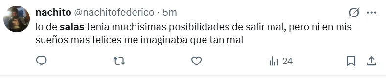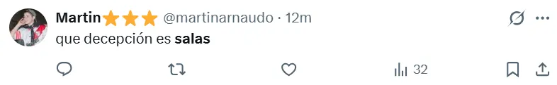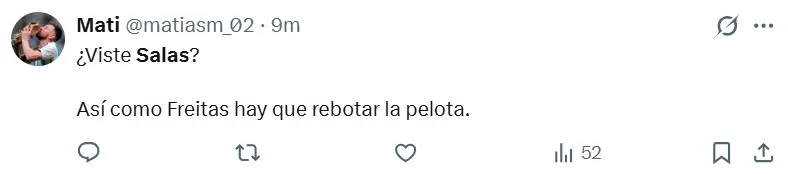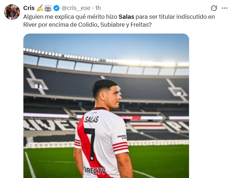 En esa sintonía, las redes sociales no tardaron en hacerse eco. Mientras transcurría el encuentro, varios simpatizantes expresaron su descontento y compararon su rendimiento con el de otros futbolistas que compiten por el mismo puesto, como el propio Freitas o Facundo Colidio. “Qué decepción”, escribió un usuario. Otro fue todavía más tajante: “Cualquiera de los tres de adelante que entró ahora es Harry Kane al lado de Salas”. Los comentarios, en una línea similar, marcaron el pulso del malestar que se vivió de manera virtual durante el partido.