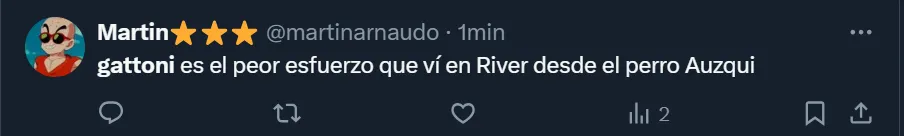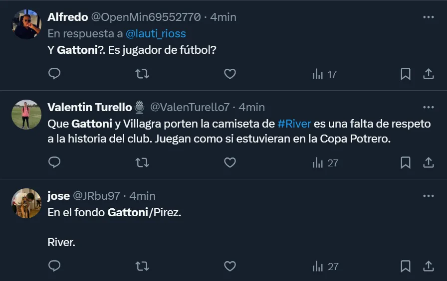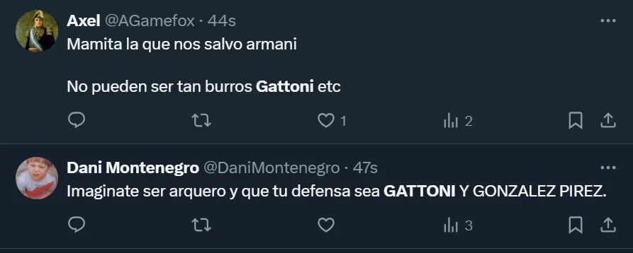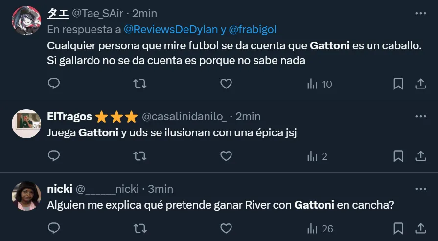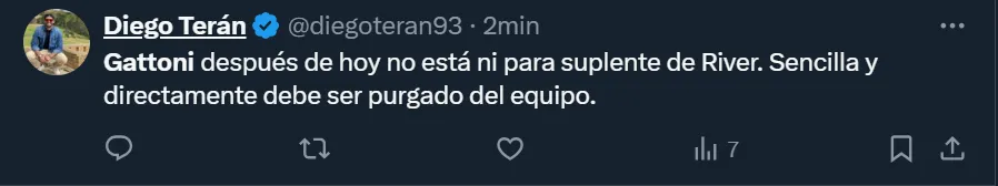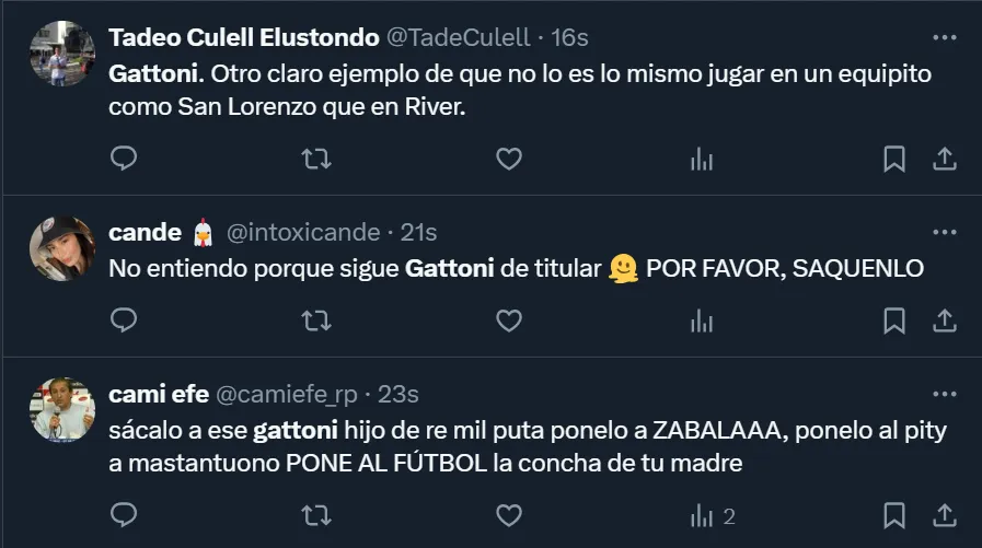 “Gattoni, después de hoy, no está ni para suplente de River. Sencilla y directamente debe ser purgado del equipo”, esbozó el usuario @diegoteran93 en Twitter, donde el ex zaguero de San Lorenzo se convirtió en tendencia a nivel nacional por lo que fue su rendimiento ante el elenco mendocino. Pero no fue el único que se mostró disconforme con el nacido en la Ciudad Autónoma de Buenos Aires.