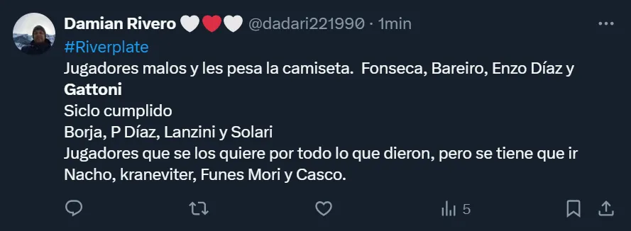 Las críticas de los hinchas de River a Federico Gattoni