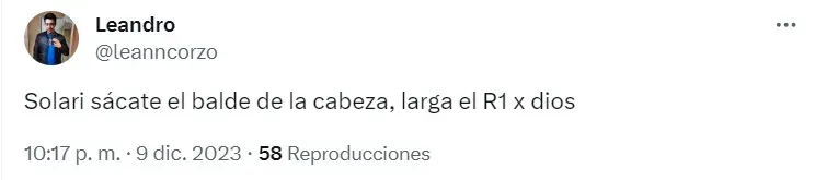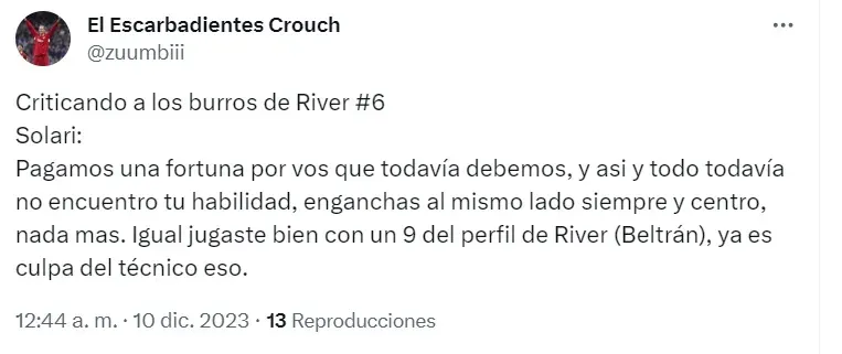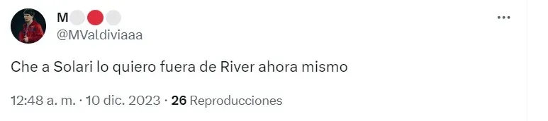 “Solari sácate el balde de la cabeza, larga el R1 x dios”, “Por qué Solari es titular??”, “Todo lo que está haciendo Solari hoy lo puede hacer mucho mejor Simon”, fueron algunos de los tantos comentarios de los fanáticos de River en las redes sociales criticando el rendimiento del futbolista.