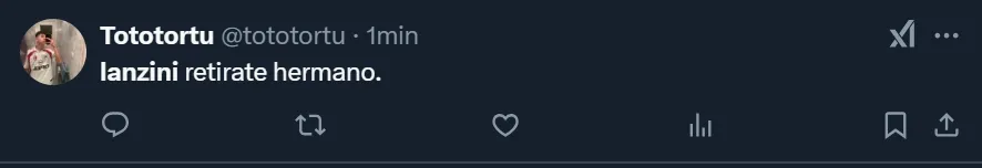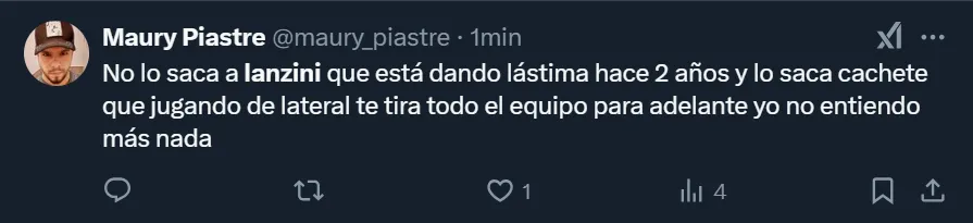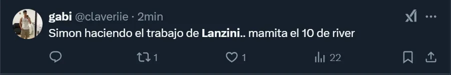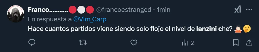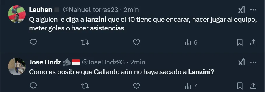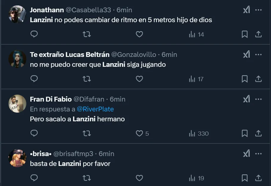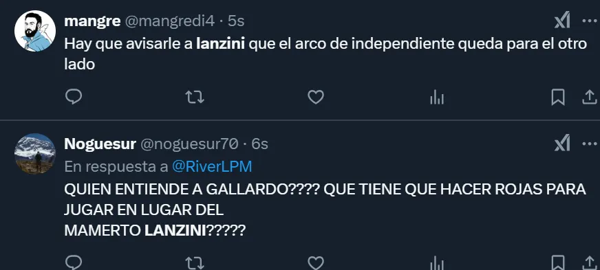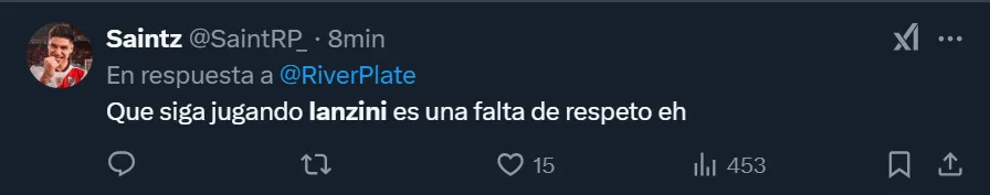 Los comentarios de los simpatizantes riverplatenses que no acudieron al Monumental y se expresaron a través de las tribunas virtuales fueron de todo tipo. Pero más allá de que solicitaron la salida del ex West Ham, el usuario @SaintRP_ apuntó contra Gallardo por dejar en cancha al 10: “Que siga jugando Lanzini es una falta de respeto, eh”, publicó en su cuenta de Twitter.