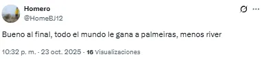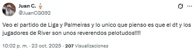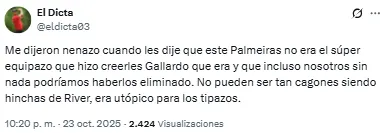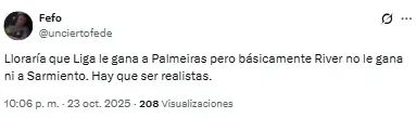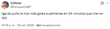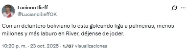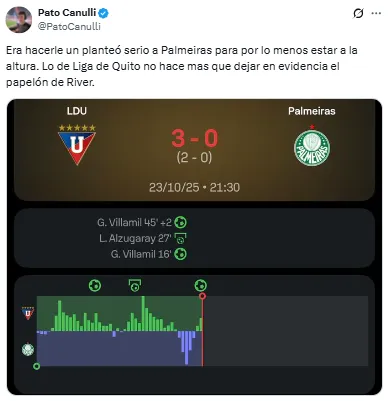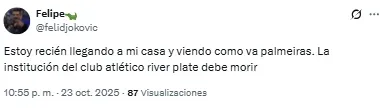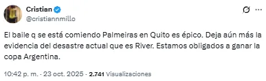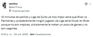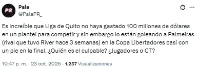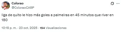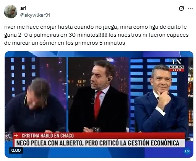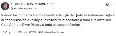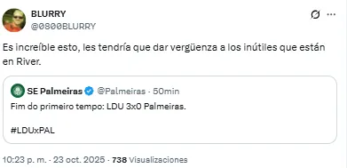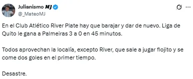 “Lo de Liga de Quito no hace más que dejar en evidencia el papelón de River”, destacó uno de los hinchas en redes sociales. Otro, en cambio, fue más agresivo: “Les tendría que dar vergüenza a los inútiles que están en River”.