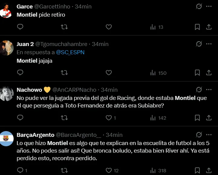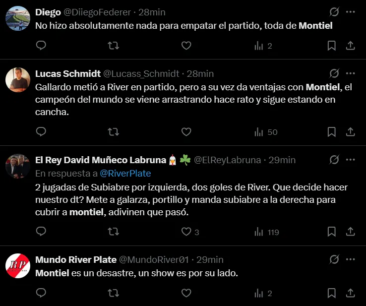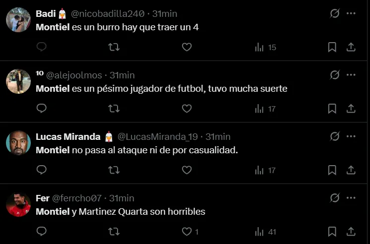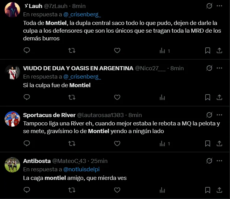 “Despertate Montiel”, “Montiel es muy burro”, “Montiel es un espanto”, “Montiel quedó pagando”, “Muy flojo el partido de Montiel”, “El peor jugador de la cancha fue Montiel”, “Que Montiel presente la renuncia”, “El año de Montiel es desastroso”, “Montiel pide retiro”, fueron algunos de los comentarios criticando al lateral derecho.