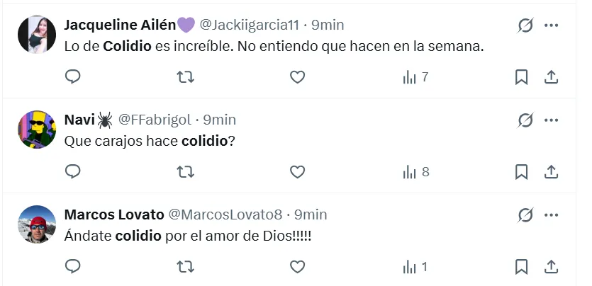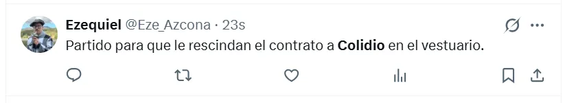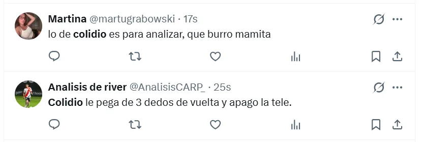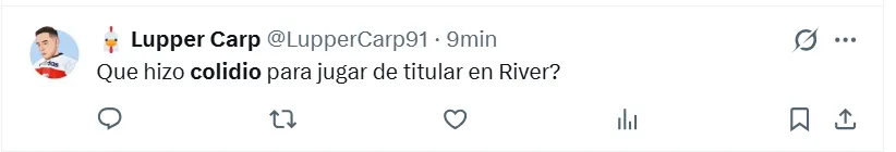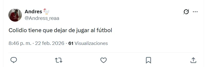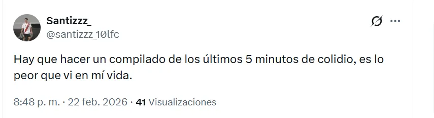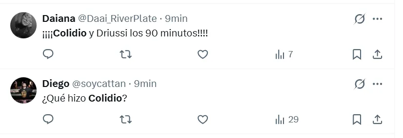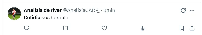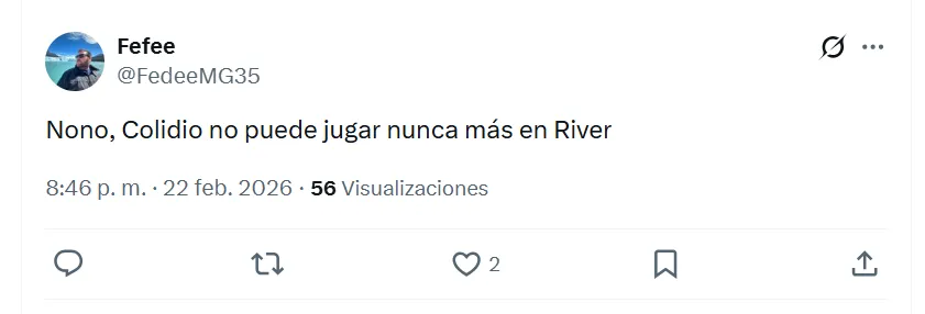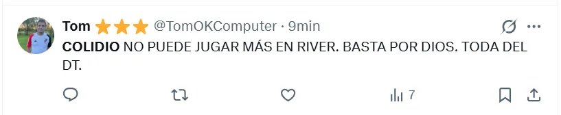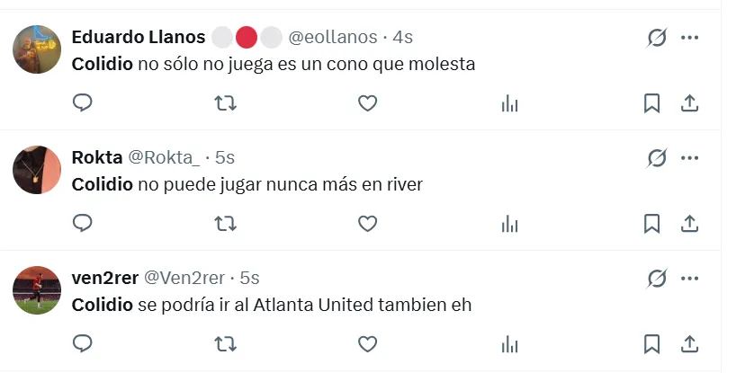 “Es lo peor que vi en mi vida“, sentenció uno de los fanáticos en X (ex Twitter) sobre Colidio. Sin embargo, no fue el único comentario que giró en torno a una crítica de ese estilo. “Lo hace a propósito“, “no puede jugar nunca más en River“, “tiene que dejar el fútbol”, “me da tristeza”, “no debe volver a pisar el Monumental“, fueron las reacciones de otros hinchas en las redes sociales.