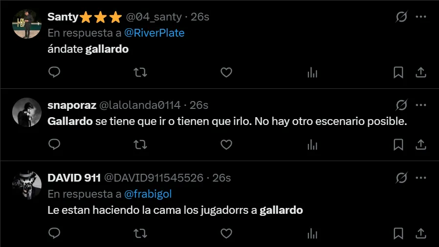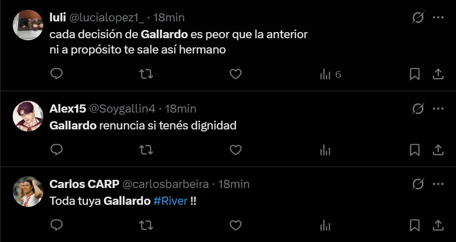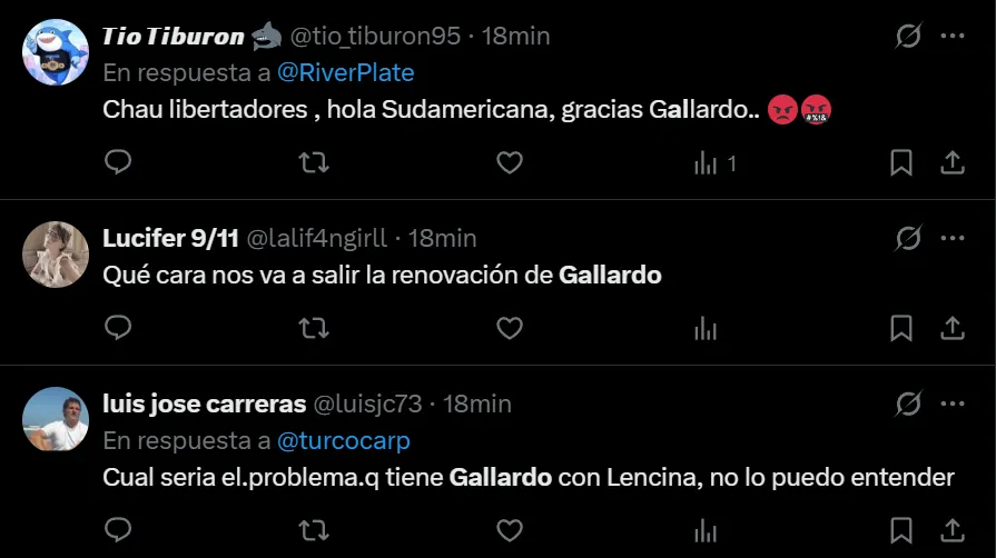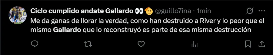 En X, el nacido en Merlo se transformó en tendencia a nivel nacional, donde en gran parte, los comentarios que realizaron los fanáticos riverplatenses estuvieron se enfocaron en pedir la renuncia del DT más ganador de la historia del club, como así también en mencionar que fue un desacierto firmar su extensión contractual.