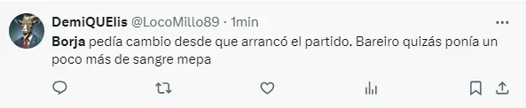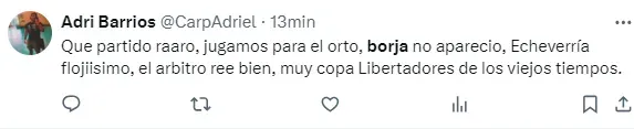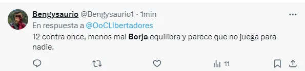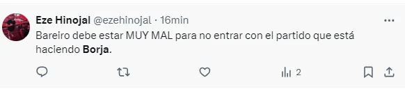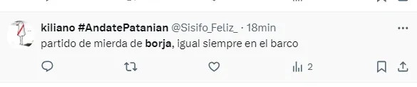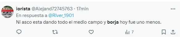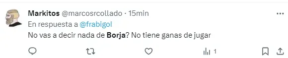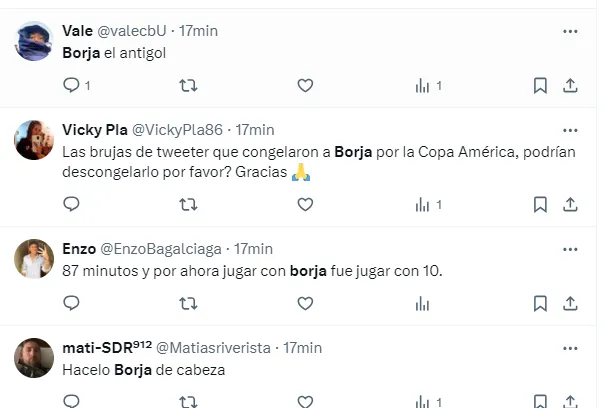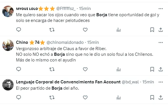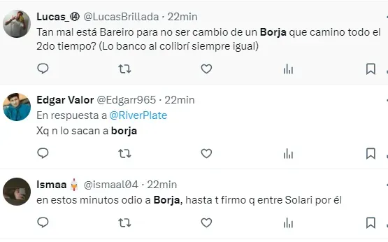 “Borja equilibra y parece que no juega para nadie”, “Borja pedía cambio desde que arrancó el partido”, “Borja no apareció”, “El peor partido de Borja en el año”, “Borja no tiene ganas de jugar”, “Borja, el antigol”, “Hoy Borja fue uno menos”, “Hasta firmo que Solari entre por él”, fueron algunos de los comentarios de los hinchas de River por el rendimiento del Colibrí.