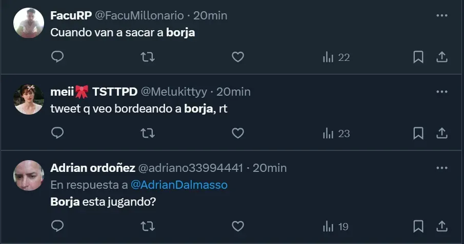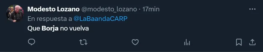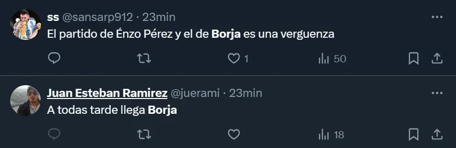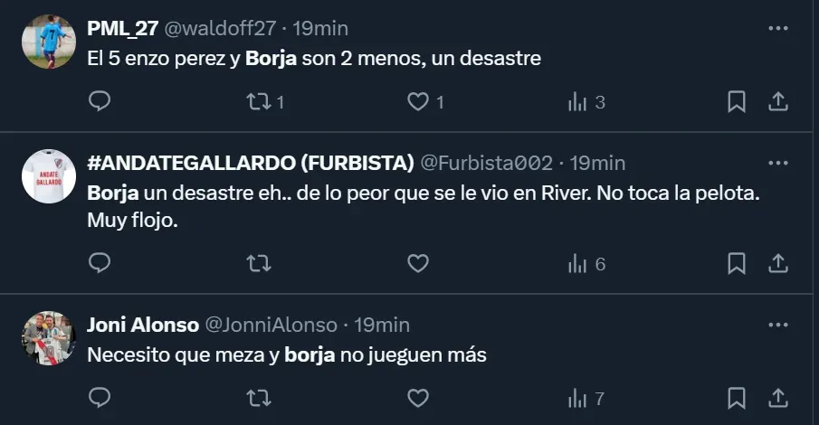 A pesar de que lo despidieron con aplausos, sobre todo en el sector de la platea San Martín Baja, el nivel de Miguel Borja no gustó para nada en Twitter y fue muy cuestionado. Incluso, hubo hinchas que pidieron que sea suplente, mientras que otros clamaron por su salida de la institución. “Es un estorbo”, escribió el usuario @Claudio57542333.