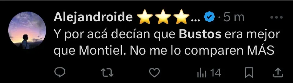 “El partido de Bustos es deprimente“, calificó un usuario, mientras que otro de ellos se mantuvo en la misma línea y sentenció: “No le dio un paso a un compañero, que se vaya tranquilo si quiere“. Incluso, algunos aprovecharon a marcar cierta diferencia de rendimiento con Gonzalo Montiel, su competidor del puesto. “Y por acá decían que era mejor, no lo comparen más“, sostuvo un simpatizante.