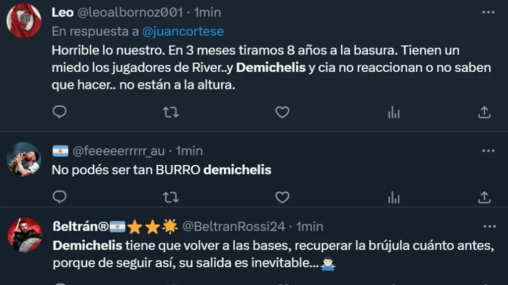 Los cuestionamientos al entrenador riverplatense continuaron por medio de la red social del pajarito, y otro de los usuarios fue más explícito: “Demichelis tiene que volver a las bases, recuperar la brújula cuánto antes porque, de seguir así, su salida es inevitable”. El hincha se enojó, y habló.