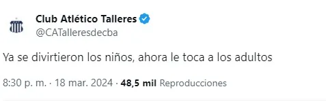 Además, en la cuenta oficial de Talleres de Córdoba también tiraron una chicana luego de que termine el sorteo de la Sudamericana, en el que comentaron para cargar al Xeneize: “Ya se divirtieron los niños, ahora le toca a los adultos”.