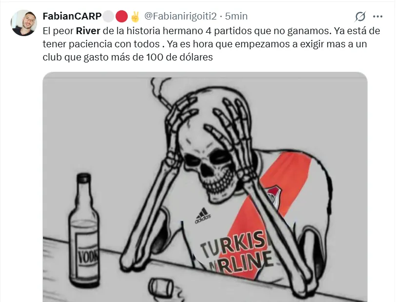 Debido a esta acumulación de pésimos resultados que no hacen más que apilarse uno atrás del otro, los hinchas explotaron en el Estadio Monumental. Los jugadores fueron fuertemente insultados y silbados desde los cuatro costados, mientras que en las redes sociales tomaron un enorme protagonismo los memes a raíz de este nuevo partido que River perdió en el último tiempo.