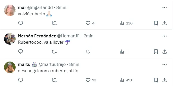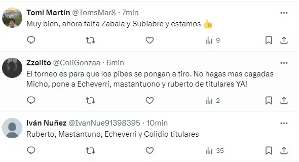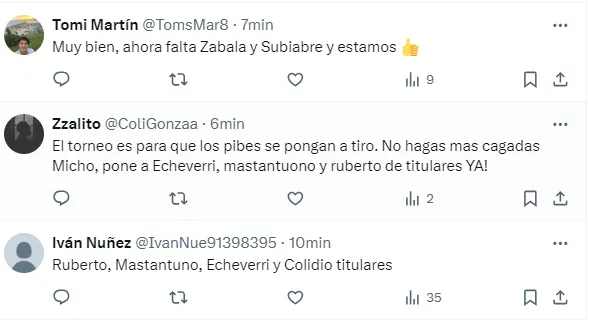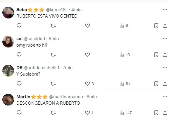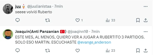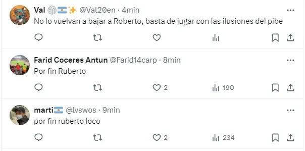 “Por fin volvió Ruberto”, “Pongan a los pibes”, “No lo vuelvan a bajar a Ruberto, basta de jugar con las ilusiones del pibe”, “Al fin Ruberto”, “Está Ruberto, pidan un deseo”, “El torneo es para que se pongan a tiro los pibes”, fueron algunos de los tantos comentarios de los hinchas celebrando la vuelta del delantero y pidiendo por más minutos para los juveniles.