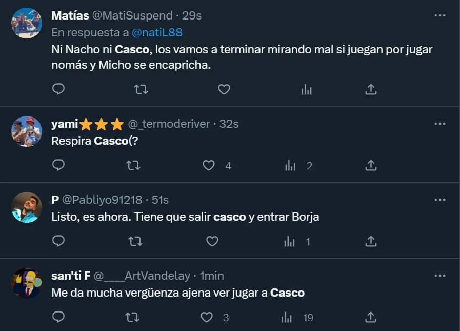 “Me da mucha vergüenza ajena ver jugar a Casco”, fue uno de los tantos comentarios que pudo verse a través de Twitter, donde los hinchas del Millonario despotricaron al ex lateral de Newell’s Old Boys. Otro de los fanáticos fue un poco más sutil: “Cómo le está costando a Casco. Es increíble”, enfatizó en la red social del pajarito. Panorama complicado para el entrerriano.