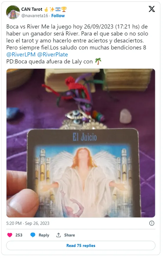 En la semana del Superclásico, los hinchas de River y Boca se aferran a lo que más les sirva para visualizarse como ganadores. Es por eso que la predicción de CAN Tarot, tarotista del Millonario, no pasó desapercibido. El pasado martes se refirió a la cita del fin de semana y fue contundente.