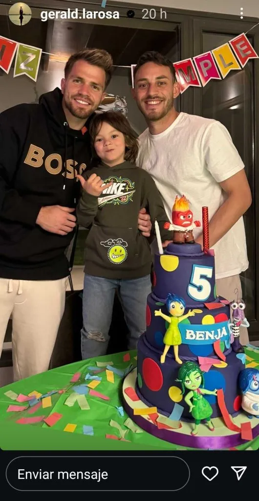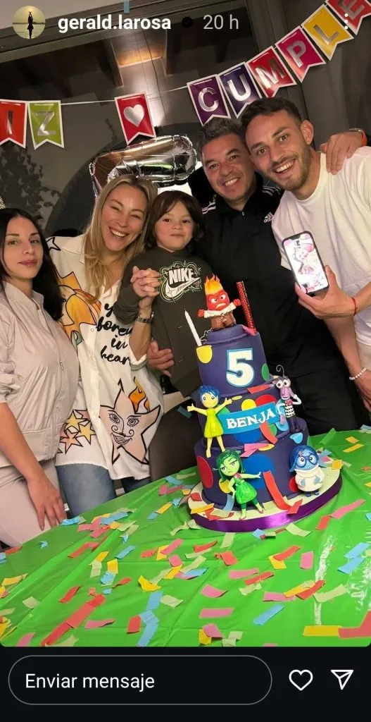 Benja cumplió cinco años y en las fotos se pudo observar una celebración con una torta con algunos personajes de Intensamente y con Geraldine, Marcelo, Nahuel -que juega en Independiente Rivadavia- y algunas personas más, entre las que se destacó Ezequiel Centurión, arquero del Millonario que también juega en la Lepra mendocina y es amigo de la familia.