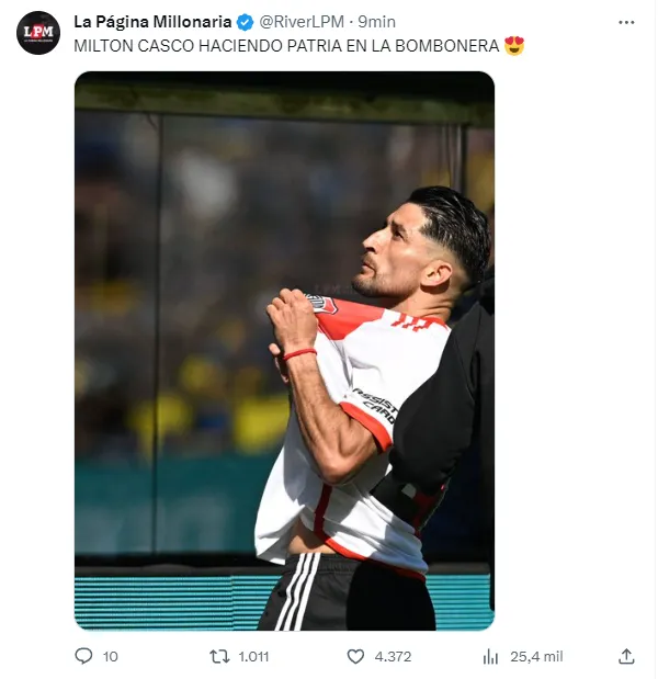 Entre tantas perlitas que dejó el cruce en La Bombonera, una de las que causó furor en Núñez tiene a Milton Casco como protagonista. El defensor cayó feo en una disputa aérea y tuvo que pedir el cambio. Si bien se fue lesionado, el experimentado futbolista del Millonario se cruzó con la tribuna del Xeneize.