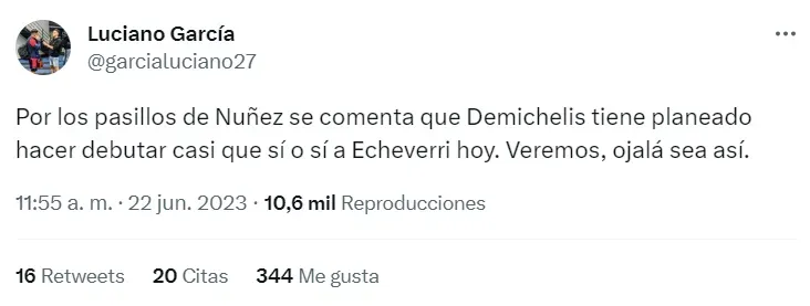 La información la dio el periodista Luciano García: “Por los pasillos de Núñez se comenta que Demichelis tiene planeado hacer debutar casi que sí o sí a Echeverri hoy. Veremos”. El Diablito, que hace un tiempo viene integrando el banco de suplentes, podría tener su tan ansiado estreno en Primera División.