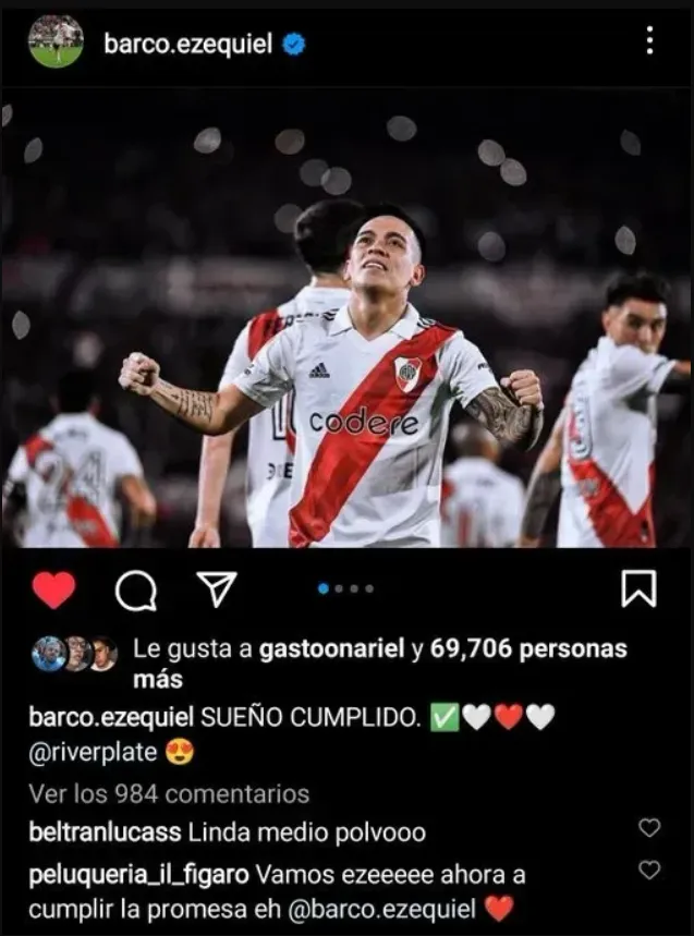 En esta oportunidad, el propio Barco utilizó su cuenta oficial de Instagram para compartir una publicación emotiva en la que se lo puede ver festejando su gol e indicando que cumplió un sueño al ser campeón con River. Pero no esperaba una respuesta.