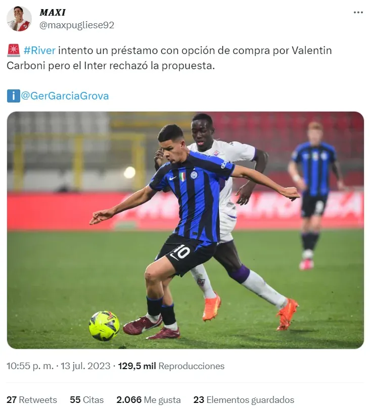 Según informó el periodista Germán García Grova, River intentó conseguir a Valentín Carboni a préstamo con opción de compra. El jugador del Inter de 18 años, que jugó la última fecha FIFA para la Selección Argentina, finalmente fue cedido al Monza de la Serie A.