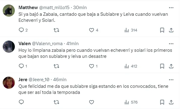 “Ni se les ocurra bajar a Subiabre”, “Si ya bajó a Zabala, cantado que baja a Subiabre y Leiva cuando vuelvan Echeverri y Solari”, “No borren a Subiabre por favor”, fueron algunos de los comentarios de los fanáticos del Millonario en las redes sociales pidiendo que el juvenil de 17 años siga siendo citado por Demichelis.
