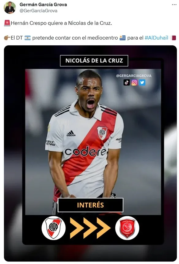 “Hernán Crespo quiere a Nicolas de la Cruz. El DT argentino pretende contar con el mediocentro para el Al-Duhail de Qatar“, informó el periodista Germán García Grova, experto en el mercado de pases, poniendo en alerta a La Banda. Aun así, todavía no se deslizó ninguna propuesta formal por el charrúa y en Núñez se sentarán a negociar, dependiendo de la oferta que se presente desde Asia. ¿Se va?