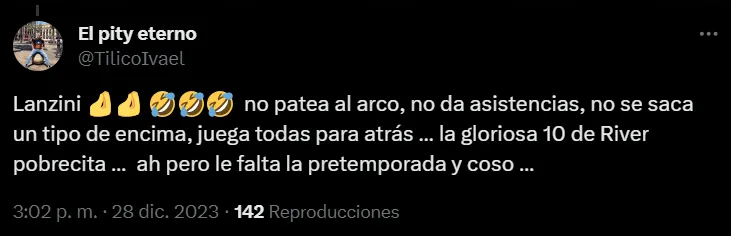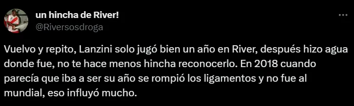 Pero, pese a ello, el mencionado Lanzini sigue siendo apuntado por un gran porcentaje de los hinchas de River. Es que tan pobre fue su producción durante este semestre que los fanáticos de la escuadra Millonaria no se olvidan de ello pese a que la temporada ya terminó y que todavía resta bastante tiempo para que comience la próxima.