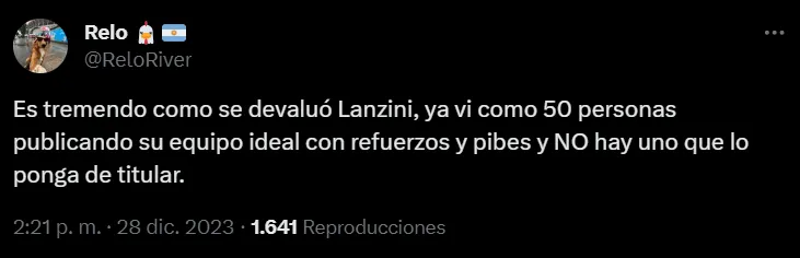 ¿Qué sucedió ahora? Los hinchas de River volvieron a hacer tendencia a Lanzini por intermedio de las redes sociales. Pese a que no hay competencia, los fanáticos recordaron el mal presente del volante ofensivo, pidieron que se mantenga su suplencia y hasta deslizaron la posibilidad de que abandone el plantel más temprano que tarde.