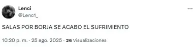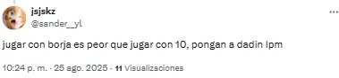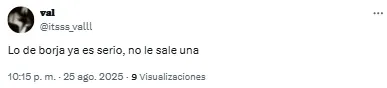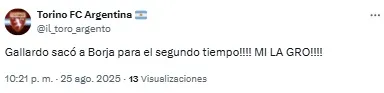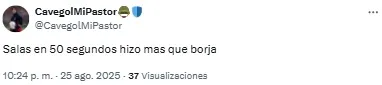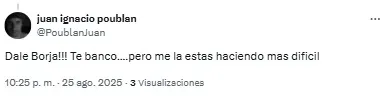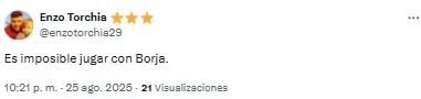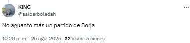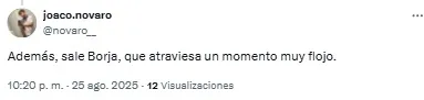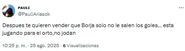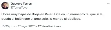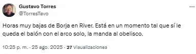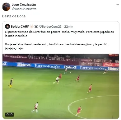 “Horas muy bajas de Borja en River. Está en un momento tal que si le queda el balón con el arco solo la manda al obelisco”, señaló uno de los usuarios. Otro, en cambio, disparó: “Lo de Borja ya es serio. No le sale una”.