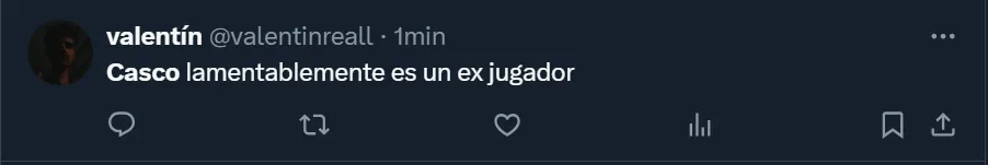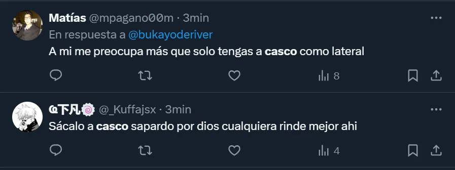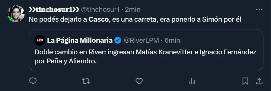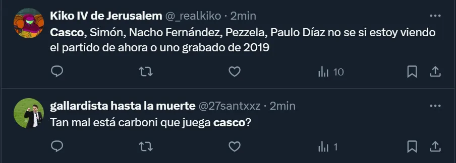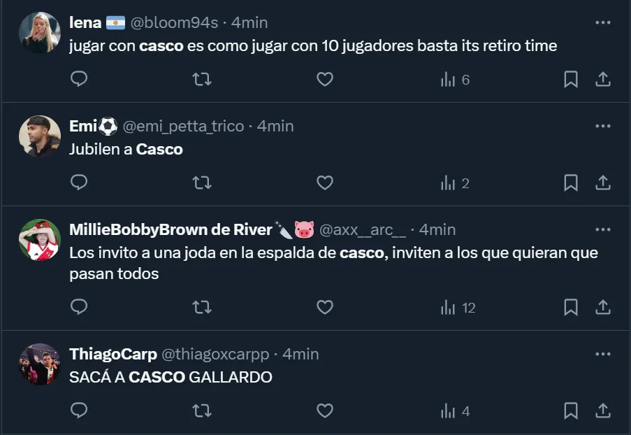 Por lo que fue el nivel del ex Newell’s Old Boys, más de un hincha pidió por su salida: “Basta de Casco, por favor”; “Casco, lamentablemente, es un ex jugador”; “Jubilen a Casco”; y “No podés dejarlo a Casco, es una carreta, era ponerlo a Simón por él”, fueron algunos de los tantos comentarios que se viralizaron entre los riverplatenses que realizaron su descargo en las redes sociales.