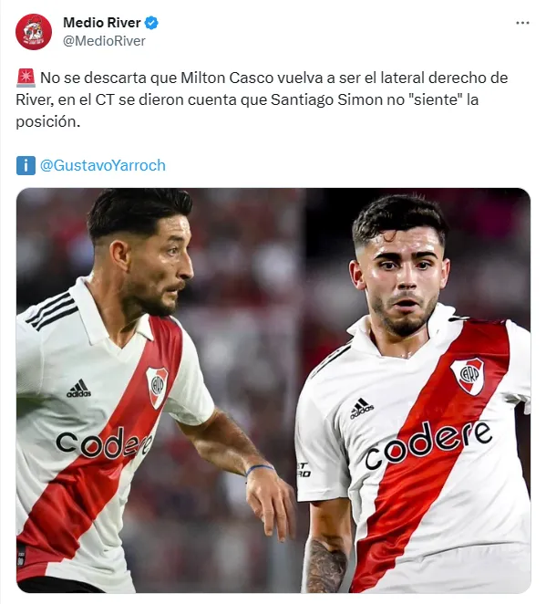 Según relató el periodista Gustavo Yarroch en ESPN F90, después de la caída contra el Fortín vuelve a surgir la posibilidad de que Milton Casco reaparezca en la formación inicial a raíz del flojo funcionamiento de Santiago Simón como lateral derecho, posición que no es de su naturaleza.