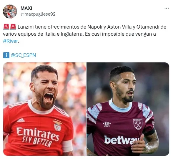 De hecho, desde ESPN revelaron dos de los equipos que habrían iniciado contacto con la representación de Lanzini para tenerlo gratis en julio. Uno de ellos tiene como figura a una pieza clave de la Selección Argentina: el Aston Villa de Dibu Martínez es uno de los interesados y factores como el conocimiento de la Premier podrían facilitar su llegada.