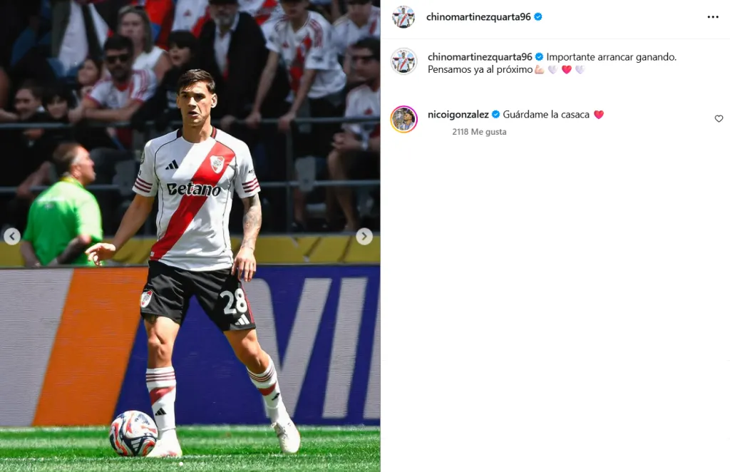 En la era de las redes sociales, pareciera casi obligatorio que los futbolistas compartan un carrete de fotos en sus redes sociales luego de un partido y escriban un mensaje positivo o esperanzador. En esta oportunidad, eso hizo Lucas Martínez Quarta tras el triunfo de River ante Urawa Red Diamonds por la primera fecha del Grupo E del Mundial de Clubes, pero lo más destacado apareció en los comentarios, cuando apareció el de Nicolás González, atacante de la Juventus y la Selección Argentina.