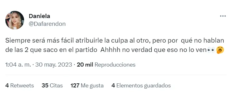 “Siempre será más fácil atribuirle la culpa al otro, pero por qué no hablan de las 2 que saco en el partido, Ahhhh no, verdad que eso no lo ven”, soltó Daniela en su cuenta oficial de Twitter. Enojadísima.