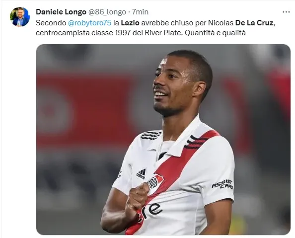 Según informó el periodista Sebastián Srur durante este domingo, De La Cruz podría marcharse a la Lazio de Italia ya que el club histórico de la Serie A “está decidido” a desembolsar el dinero necesario para que se ejecute la cláusula de rescisión que hoy existe en el contrato del charrúa con River. Daniele Longo, periodista de Calciomercato, agrega que las charlas están avanzadas.