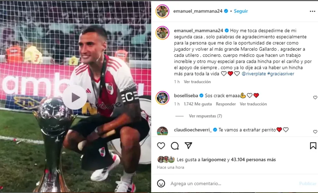 A dos días de esa fecha, sabiendo ya que deberá buscar sitio en otro equipo para dar continuidad a su carrera, Mammana publicó un mensaje de despedida en sus redes sociales con alto contenido sentimental. Le agradeció a Marcelo Gallardo por darle la oportunidad de regresar a inicios del año pasado.