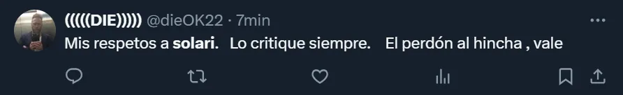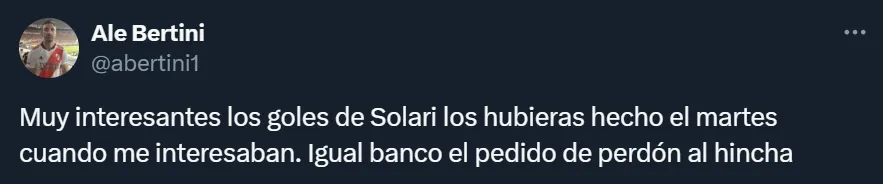 A través de Twitter, pudieron leerse comentarios como “mis respetos a Solari. Lo critiqué siempre. El perdón al hincha vale“, “muy interesantes los goles de Solari. los hubieras hecho el martes, cuando me interesaban. Igual banco el pedido de perdón al hincha” y “Solari pidió disculpas, entendió todo“. A pesar del dolor que sigue latente en el mundo River, de a poco los hinchas empiezan a reconciliarse con los jugadores.