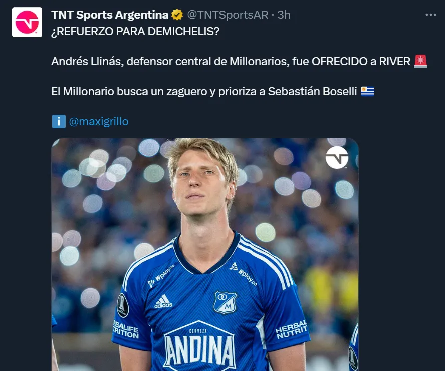 Luego de que comenzaran a surgir diferentes nombres, donde más de uno buscó acertar el jugador en cuestión, fue el periodista Maximiliano Grillo quien aseguró que es Andrés Llinás el zaguero central que le ofrecieron a los directivos de River.