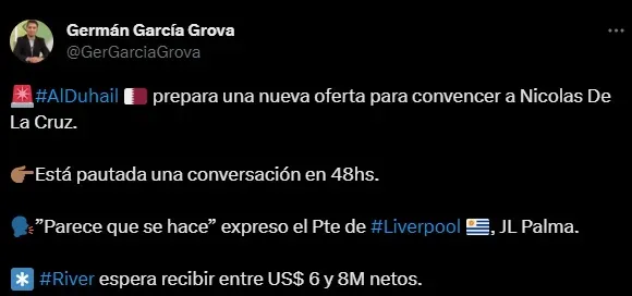 Conociendo desde hace varios días las ganas del Al Duhail de Hernán Crespo por contar con Nicolás De La Cruz, en el Millonario no veían al destino qatarí como una posibilidad real. Realidad que podría cambiar tras los dichos de José Luís Palma.