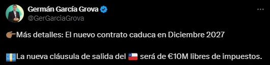 Con contrato hasta 2026, el caudillo chileno extenderá su vínculo por un año más hasta diciembre del 2027 y recibirá una considerable mejora salarial para alejar las tentaciones de los petrodólares del mundo árabe en este mercado y en posibles futuros intereses desde medio oriente. Y para sumar a ello, también se le mejorará la cláusula de rescisión, que hasta esta nueva firma era de 8 millones de dólares. Ahora, pasará a ser de 10 millones de dólares libres de impuestos.