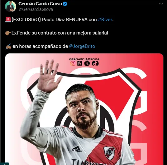 El Al Qadsiah de la liga de Arabia Saudita se había mostrado dispuesto a pagar la clásula de rescisión de Paulo Díaz, y en ese caso la decisión recaía directamente en el jugador. Sin embargo, tanto el chileno como River querían esperar hasta la culminación de su participación en la Copa América para definir su futuro. Este miércoles, se conoció la postura final de todas las partes, ya que el periodista Germán García Grova confirmó que Díaz renovará su contrato con el Millonario y seguirá ligado al club de Núñez.