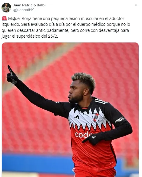 Así, el conjunto de Martín Demichelis había encontrado a su carta goleadora para este año en los pies de Borja para dejar de extrañar a Julián Álvarez y Lucas Beltrán. Sin embargo, en el momento más importante de este inicio de temporada, el ex Gremio y Palmeiras sufrió una lesión y su presencia en el Superclásico es una incertidumbre.