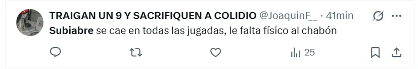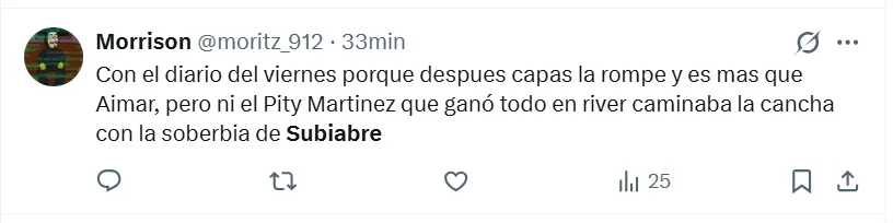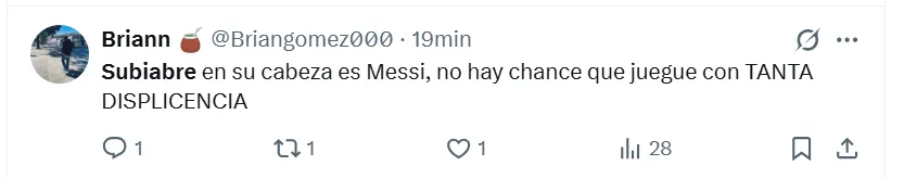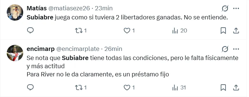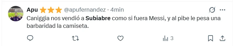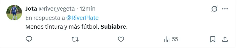 Lo cierto es que, en la goleada ante Belgrano de Córdoba, los hinchas de River criticaron a Ian Subiabre. El joven delantero alternó buenas y malas, pero estuvo en una sintonía inferior al resto de sus compañeros, que sí hicieron un gran partido. “Caniggia nos vendió a Subiabre como si fuera Messi y al pibe le pesa una barbaridad la camiseta“, expresó un fanático en X (ex Twitter).